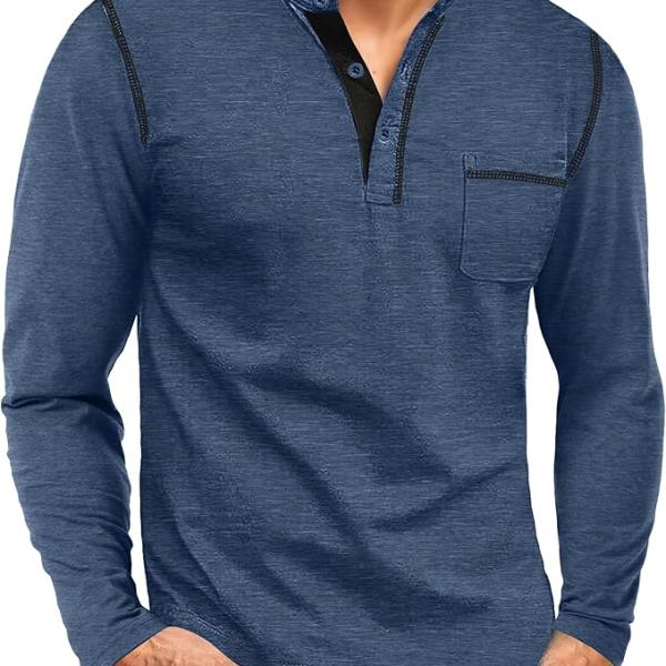 Classic Henley Tee:Color contrast long sleeve henley with a 3 button placket and chest pocket. Made with sturdy stitching for a clean, casual look. A timeless wardrobe essential.