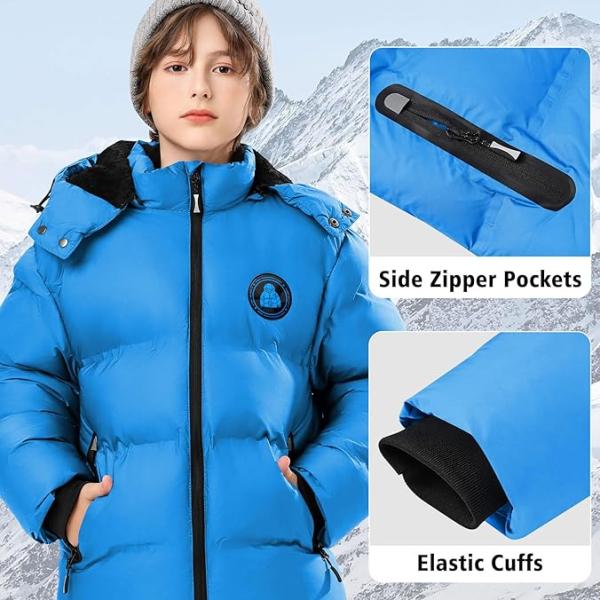 Comfort Design: Featuring a detachable hood with fleece lining and elastic cuffs, the kids' winter coat provides a snug fit while blocking cold drafts for all-day comfort.