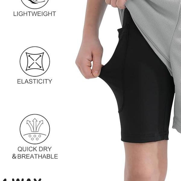 【2 in 1 Design】kids' performance shorts feature a double-layer design. The outer layer is lightweight, loose and quick-drying, with an elastic adjustable waistband. The inner layer is soft, slim, and breathable, with a built-in super-elastic compression support structure that keeps you cool and flexible during exercise.